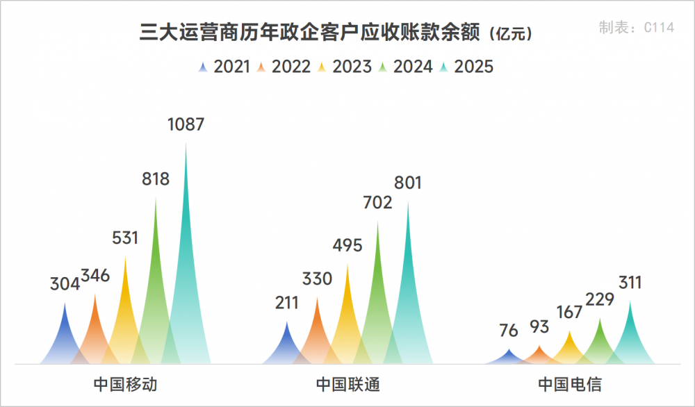 2025年,三大运营商政企客户应收账款余额继续增长,根据年报披露数据: