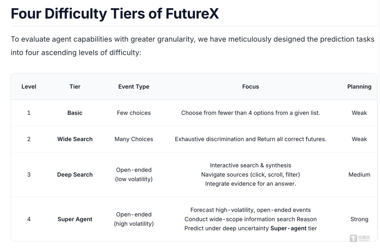 FutureX采用的是“折叠式”评分逻辑,拒绝模型靠蒙对简单的“是与否”来刷分。它大幅压缩了二元对立事件的数量,并将难度分为四个等级: