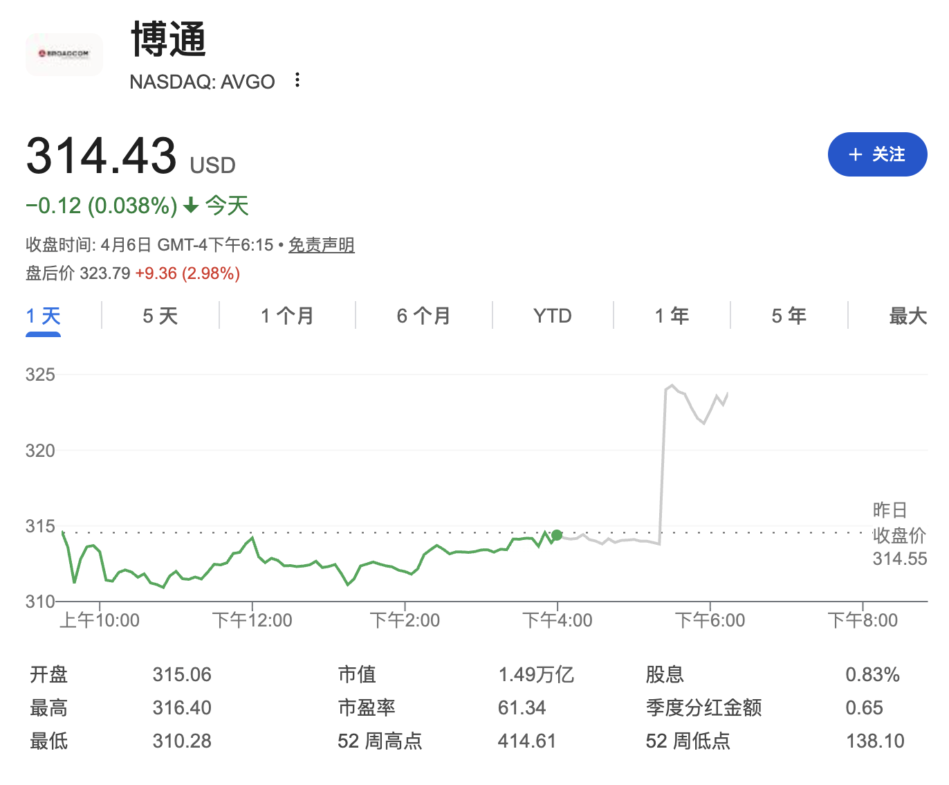 博通股价在盘后交易中上涨3%。谷歌母公司Alphabet股价基本持平。