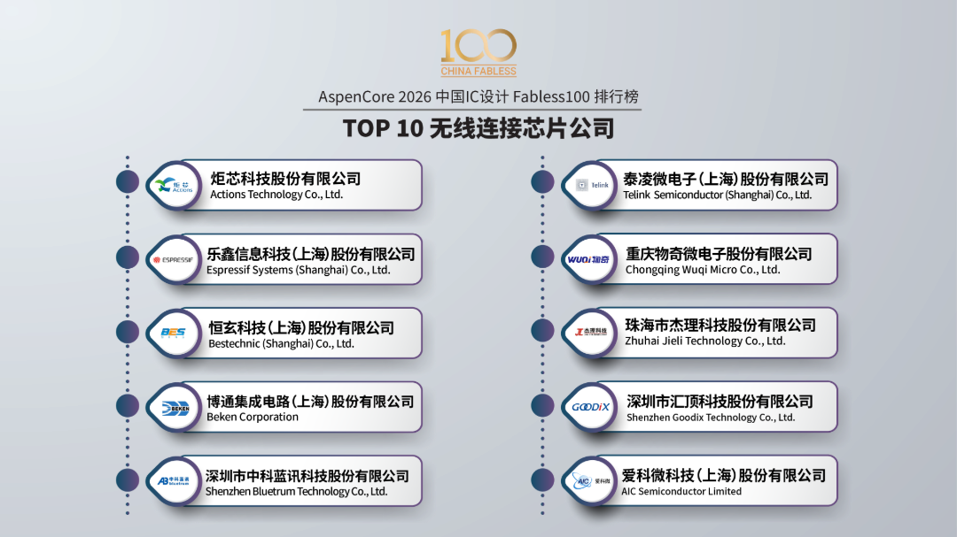 在同期举办的中国IC领袖峰会上, AspenCore重磅揭晓2026中国IC设计Fabless 100排行榜。该榜单目前已经成为观察中国IC设计产业的重要风向标。物奇作为国内领先的网络通信与智能终端芯片设计企业,凭借在高速网络通信、端侧AI技术领域的前瞻布局以及核心业务的快速突破,连续四年入选中国IC设计Fabless 100排行榜之Top10无线连接公司,标志着物奇已成长为中国半导体产业链中的重要力量。