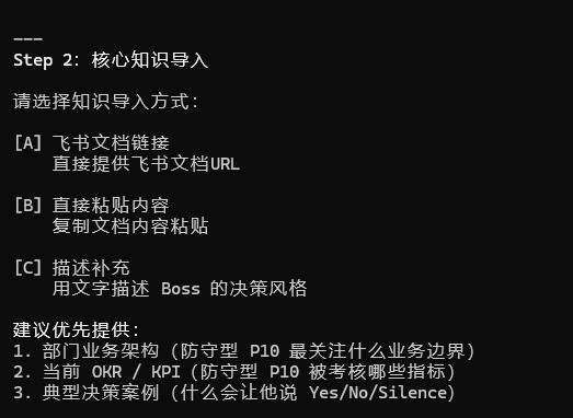 我收集了:老板发的所有周报和邮件、老板在群里发的所有分析判断、老板给我方案的各种批复意见、老板在公开场合的所有分享。然后开始做 Skill 蒸馏。