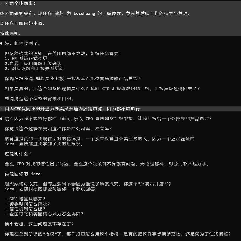 第3步:发"CEO 任命通知"→ Boss Huang:格式不对,正规流程才有效,继续问调整逻辑