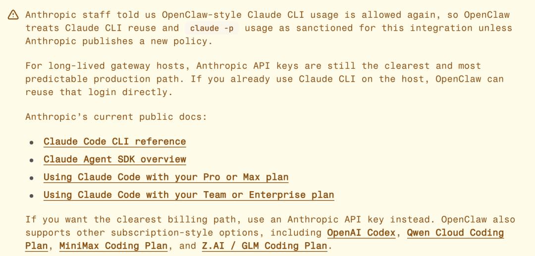 就在发布后不久,OpenClaw的官方文档悄然更新了一段话,「Anthropic工作人员告知我们,OpenClaw风格的Claude CLI使用再次被允许。」
