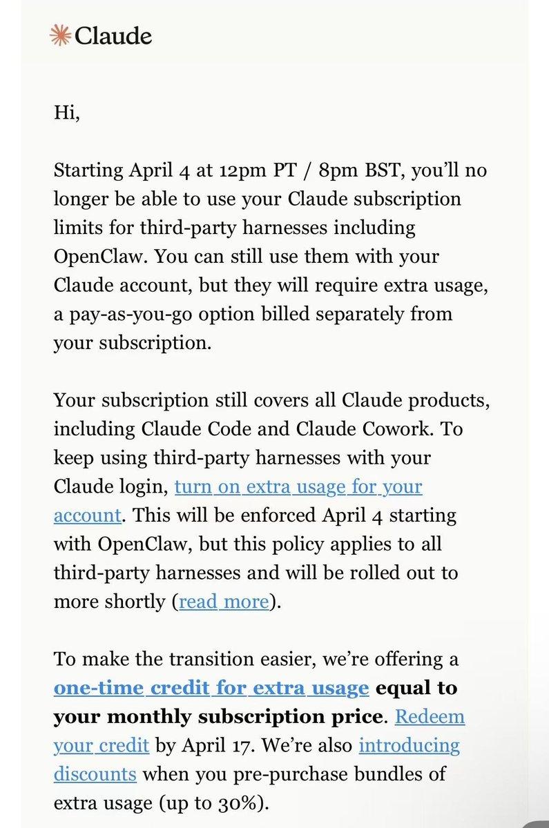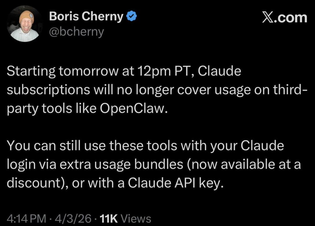 4月4日中午12点(太平洋时间),Anthropic向所有用户发送邮件,宣布Claude Pro和Max订阅将不再覆盖OpenClaw等第三方工具的使用。