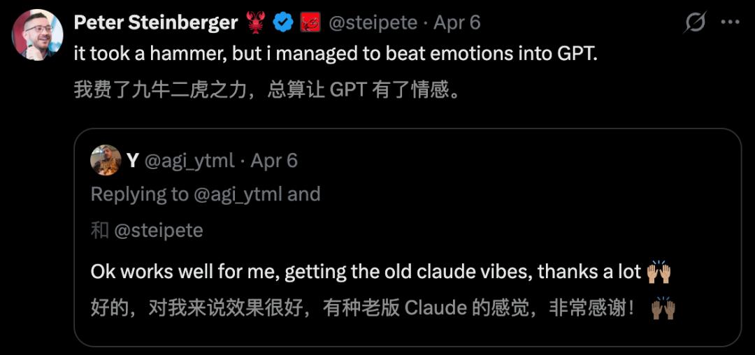OpenClaw之父称,这可是自己耗费很大精力,才让GPT有了情感。