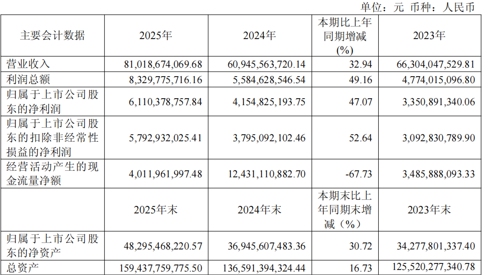 根据业绩快报,2025年度公司实现营业总收入352.51亿元,较上年同期增长45.24%;实现营业利润8.56亿元,同比增长182.42%;归属于上市公司股东的净利润为5.44亿元,较上年同期的2.64亿元增长106.06%;扣除非经常性损益后的净利润为5.19亿元,同比增长70.22%。基本每股收益为1.18元,同比增长103.45%。