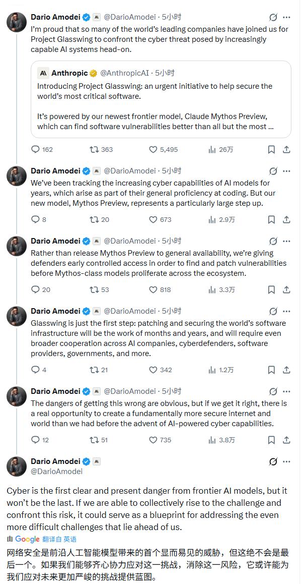 在社交媒体上,Anthropic首席执行官达里奥·阿莫代伊(Dario Amodei)的发言显得忧虑多过兴奋。他认为Mythos所展示的漏洞挖掘能力,只是前沿AI带来的第一个清晰而紧迫的风险。