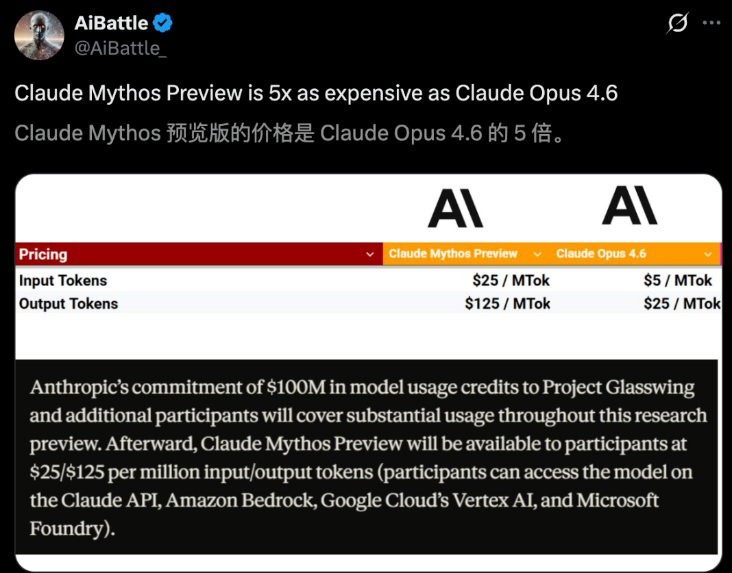按照Anthropic公布的价格,Mythos Preview的定价为输入每百万token 25美元、输出每百万token 125美元,约为Opus 4.6的五倍。