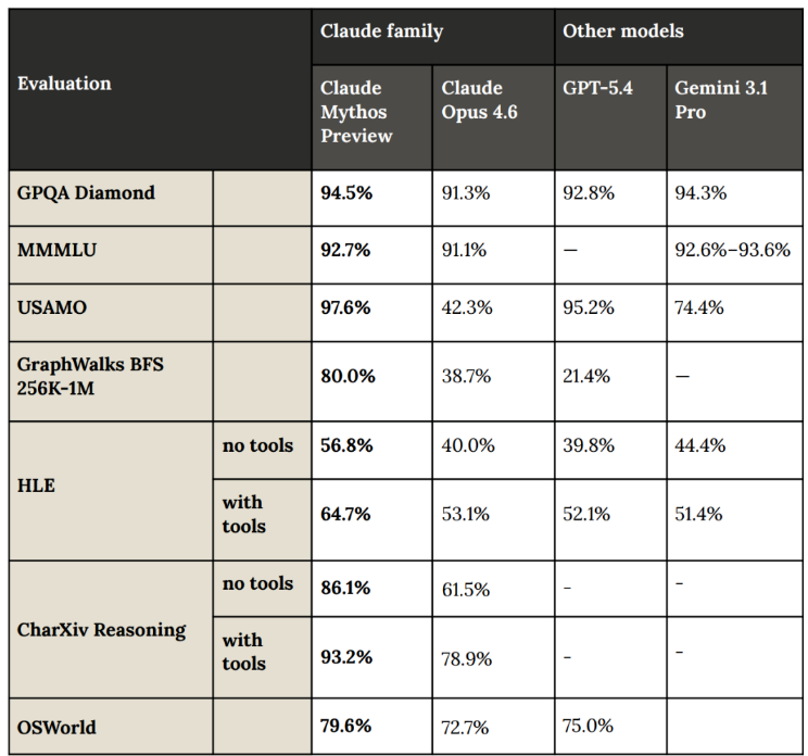 在编程基准SWE-bench Verified上,Mythos得分93.9%,Opus 4.6为80.8%;在难度更高的SWE-bench Pro上,Mythos以77.8%对53.4%大幅领先,差距接近25个百分点。在终端Agent任务Terminal-Bench 2.0中,Mythos得分82.0%,Opus 4.6为65.4%;在USAMO 2026数学竞赛中,Mythos斩获97.6%,Opus 4.6仅拿42.3%。