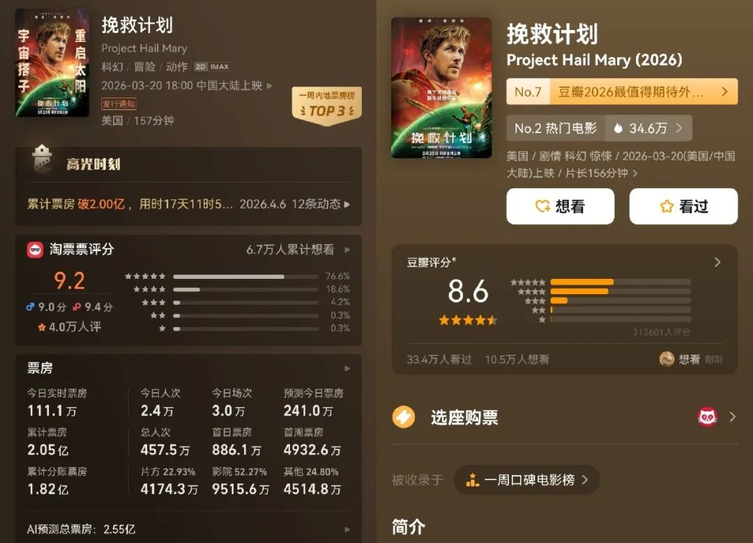 目前上映进入第三周的《挽救计划》依旧势头不减,全球票房已突破 4.2 亿美元,北美首周 8050 万,成为 2026 年最大开画影片。烂番茄 95% ,豆瓣 8.6 分,国内上映 9 天破亿,也是春节档后首部票房破亿院线电影。