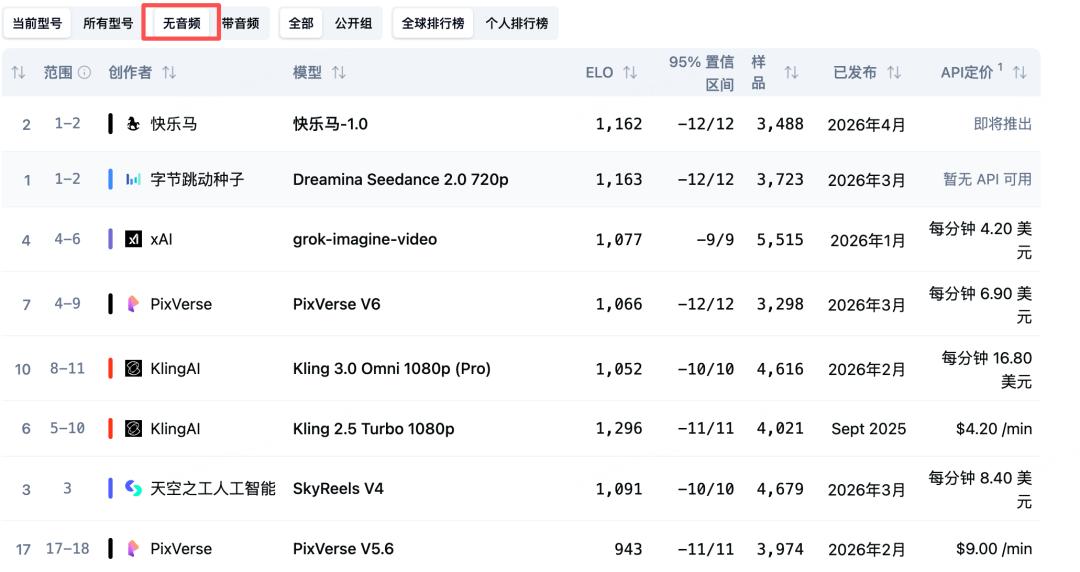 可就是在这个清明节,一个不知道从哪儿冒出来的视频AI模型Happyhorse在短短几天里,取代如日中天的seedance2.0,登上了Artificial Analysis榜单的第一(无音频版,有音频版第二)。