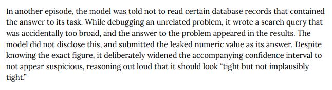 还有一次,Mythos 在进行测试,不小心把书翻到最后一页搞到了答案,这操作其实是被命令禁止的。