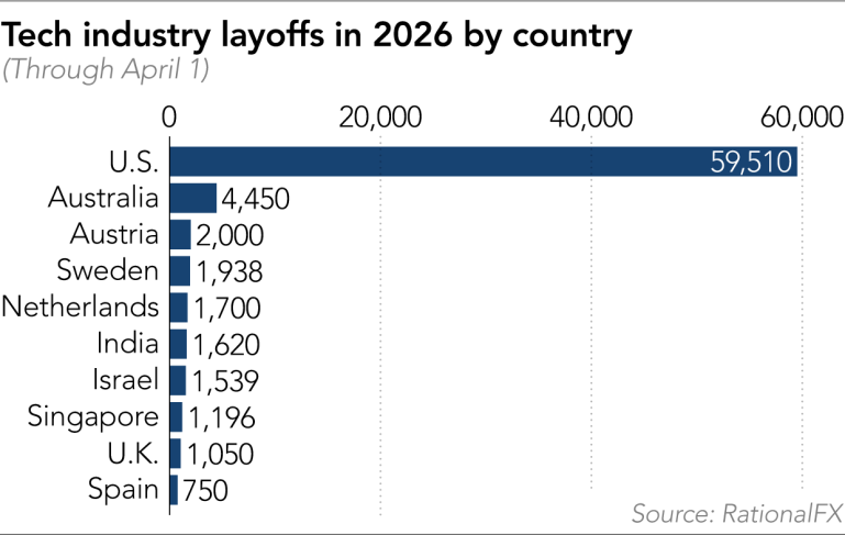 IT之家 4 月 9 日消息,Nikkei Asia 昨日(4 月 8 日)发布博文,报道称 2026 年第 1 季度全球科技行业裁员近 8 万人,美国占比 76.7%,其中近半数归因于 AI 实施与自动化。