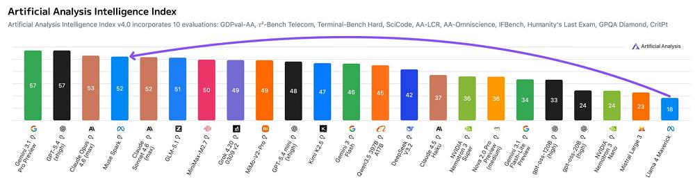 在大模型测评平台Artificial Analysis上,Muse Spark的智能指数直接从Llama 4 Maverick的18分,跳到了52分,介于Claude Sonnet 4.6和Claude Opus 4.6之间,算是进入第一梯队了。