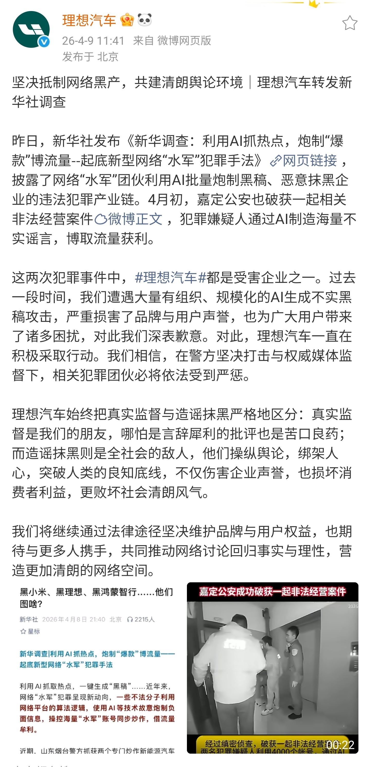 这两次犯罪事件中,理想汽车都是受害企业之一。过去一段时间,公司遭遇大量有组织、规模化的 AI 生成不实黑稿攻击,严重损害了品牌与用户声誉,也为广大用户带来了诸多困扰,对此深表歉意。对此,理想汽车一直在积极采取行动。理想汽车相信,在警方坚决打击与权威媒体监督下,相关犯罪团伙必将依法受到严惩。