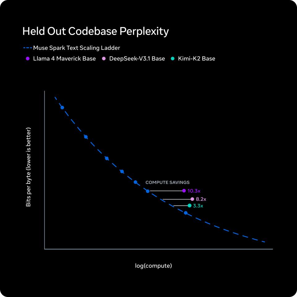 通过对一系列小模型拟合规模化定律,Meta得出结论:与Llama 4 Maverick相比,Muse Spark达到相同能力水准所需的训练计算量减少了一个数量级以上。这一效率优势,也使其在主流基础模型横向比较中脱颖而出。