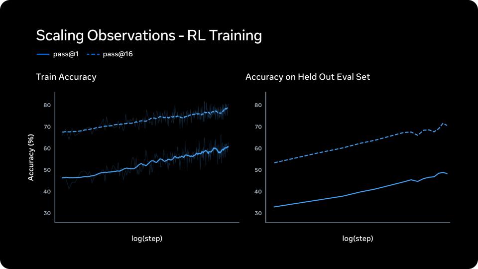 训练数据上pass@1与pass@16呈对数线性增长,表明强化学习在提升模型可靠性的同时,并未损害推理多样性;留存评估集上的准确率同步稳定提升,证明训练收益能够真实泛化到未见任务上——而不是“只会考试”。