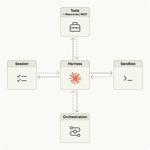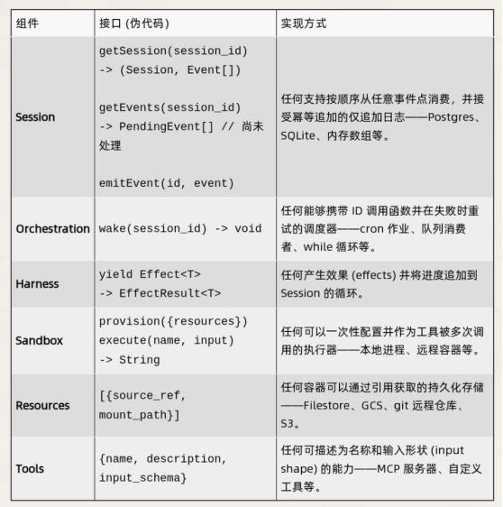 在最新的技术文章中,他们将Agent系统拆成三个独立的部分:模型与调度逻辑(“大脑”)、执行环境与工具(“手”),以及记录全部过程的会话日志(session)。