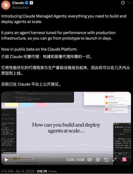 凌晨,Anthropic 发布了Claude Managed Agents,一套用于构建和部署云端智能体的托管工具。