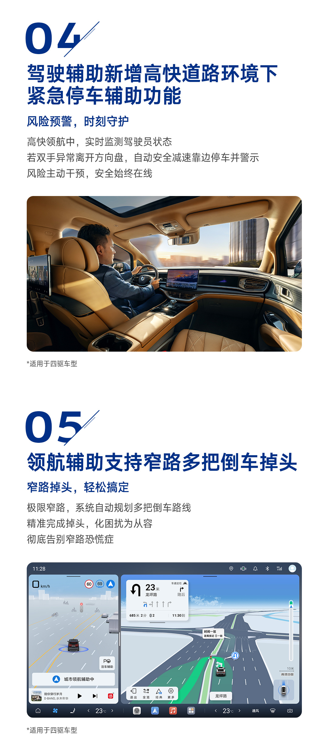 • 驾驶辅助新增高快道路环境下紧急停车辅助功能:高快领航中,实时监测驾驶员状态,若双手异常离开方向盘,自动安全减速靠边停车并警示