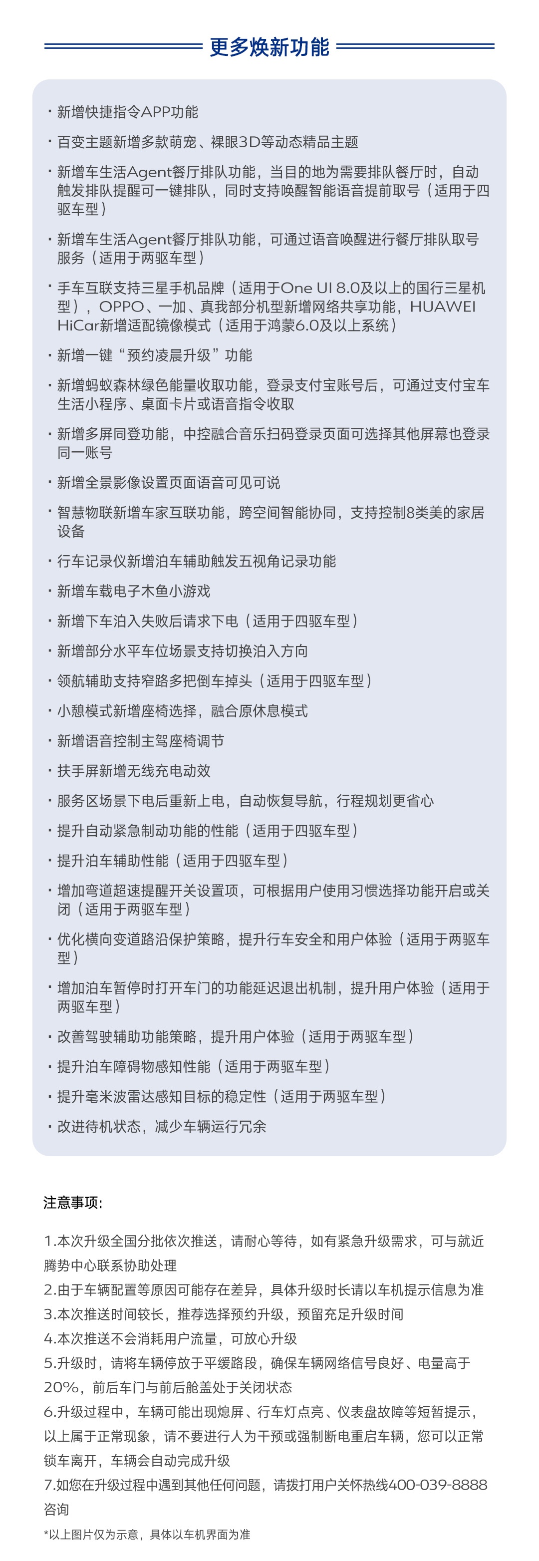 • 新增车生活 Agent 餐厅排队功能,可通过语音唤醒进行餐厅排队取号服务(适用于两驱车型),手车互联支持三星手机品牌(适用于 One UI 8.0 及以上的国行三星机型),OPPO 加真我部分机型新增网络共享功能,HUAWEI HiCar 新增适配镜像模式(适用于鸿蒙 6.0 及以上系统)