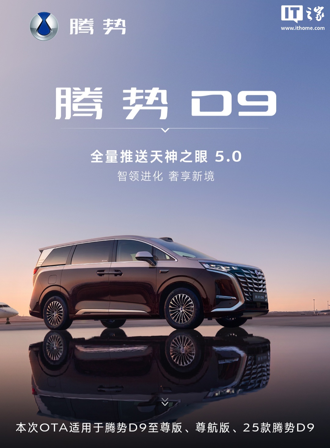 IT之家 4 月 9 日消息,比亚迪腾势汽车今日宣布,腾势 D9 全量推送天神之眼 5.0,新增强化学习端到端大模型,同时带来了智舱 UI 焕新和辅助驾驶报告。本次 OTA 适用于 D9 至尊版 / 尊航版和 25 款 D9。