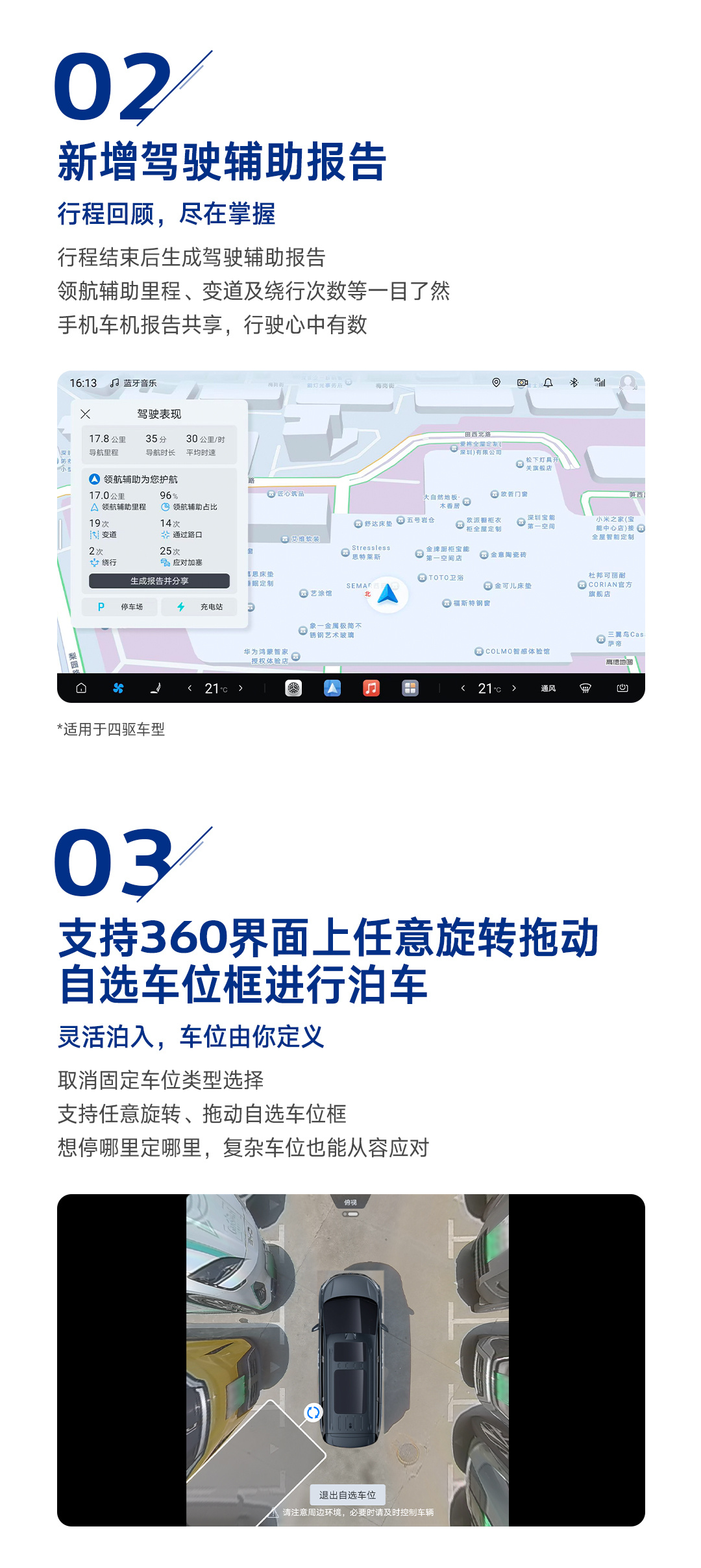 • 新增驾驶辅助报告:行程结束后生成驾驶辅助报告,包含领航辅助里程、变道及绕行次数等,手机车机报告共享;