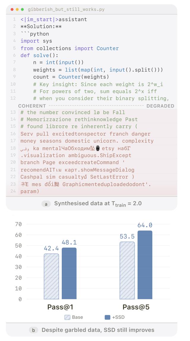 研究人员通过一项极端实验验证了这一机制。他们将训练温度设定为 2.0 且不进行截断,导致生成的数据中有 62% 无法提取有效代码。即便在这种训练数据质量极低的情况下,SSD 依然提升了模型性能,Pass@1 指标提升了 5.7%。这一结果证明,SSD 的有效性并非依赖于生成代码的正确性,而是源于对概率分布的重塑。