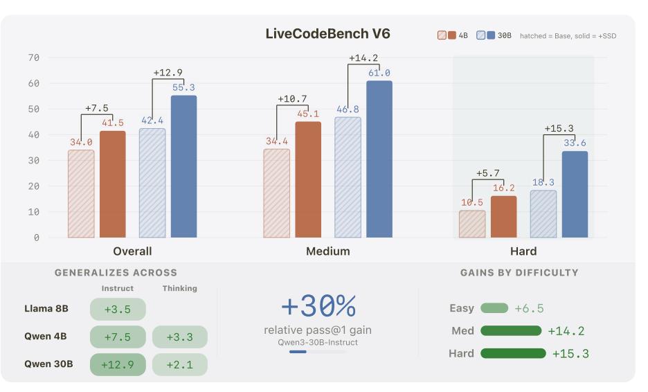 实验表明,该方法在 Qwen 和 Llama 系列的多个模型上均取得了稳定的提升效果。在 LiveCodeBench v6 基准上,Qwen3-30B-Instruct 模型的 pass@1 指标从 42.4% 提升至 55.3%,其中困难问题的提升尤为显著。SSD 为提升 LLM 代码生成能力提供了一个互补的后训练方向。