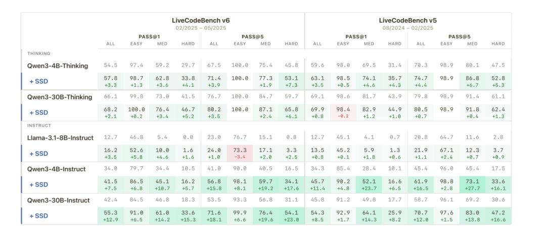 这种提升具有普遍性。该方法不仅在 Qwen 系列模型上有效,在 Llama 系列模型上也表现良好。实验覆盖了 4B、8B 和 30B 等多种不同规模的模型。无论是 Instruct 版本还是 Thinking版本,应用 SSD 后都能获得性能的提升。