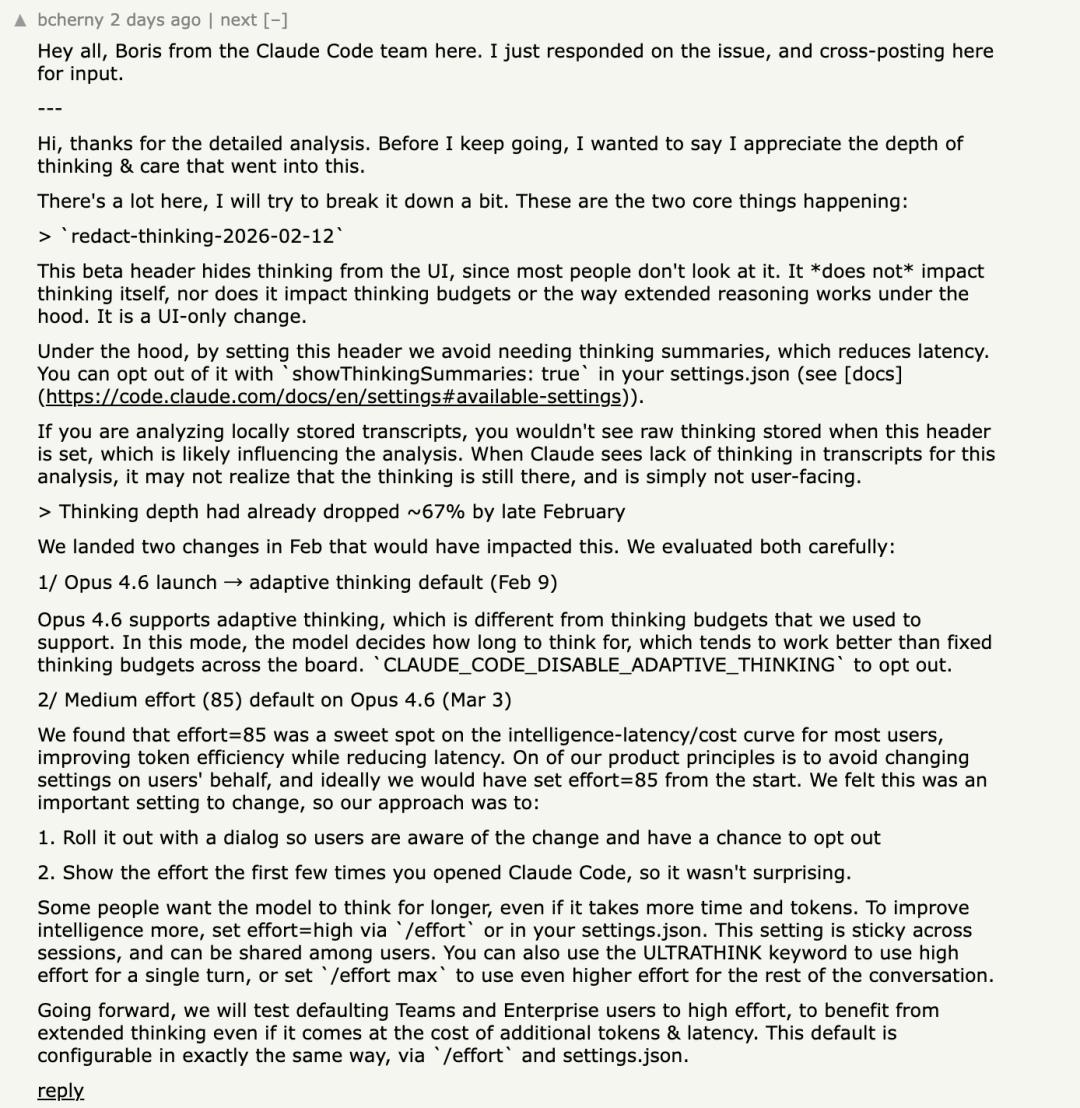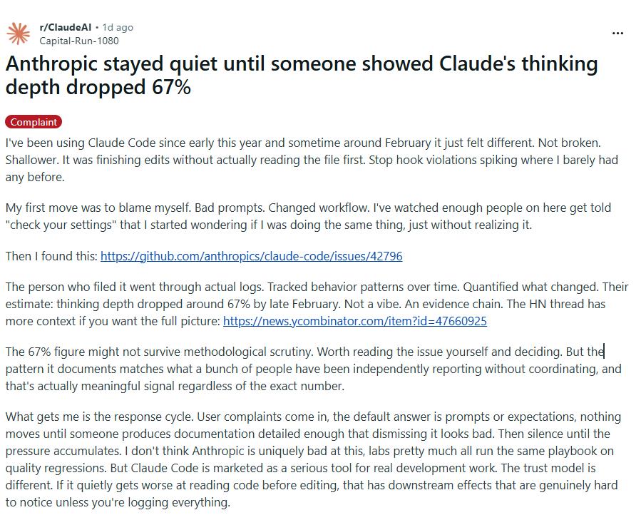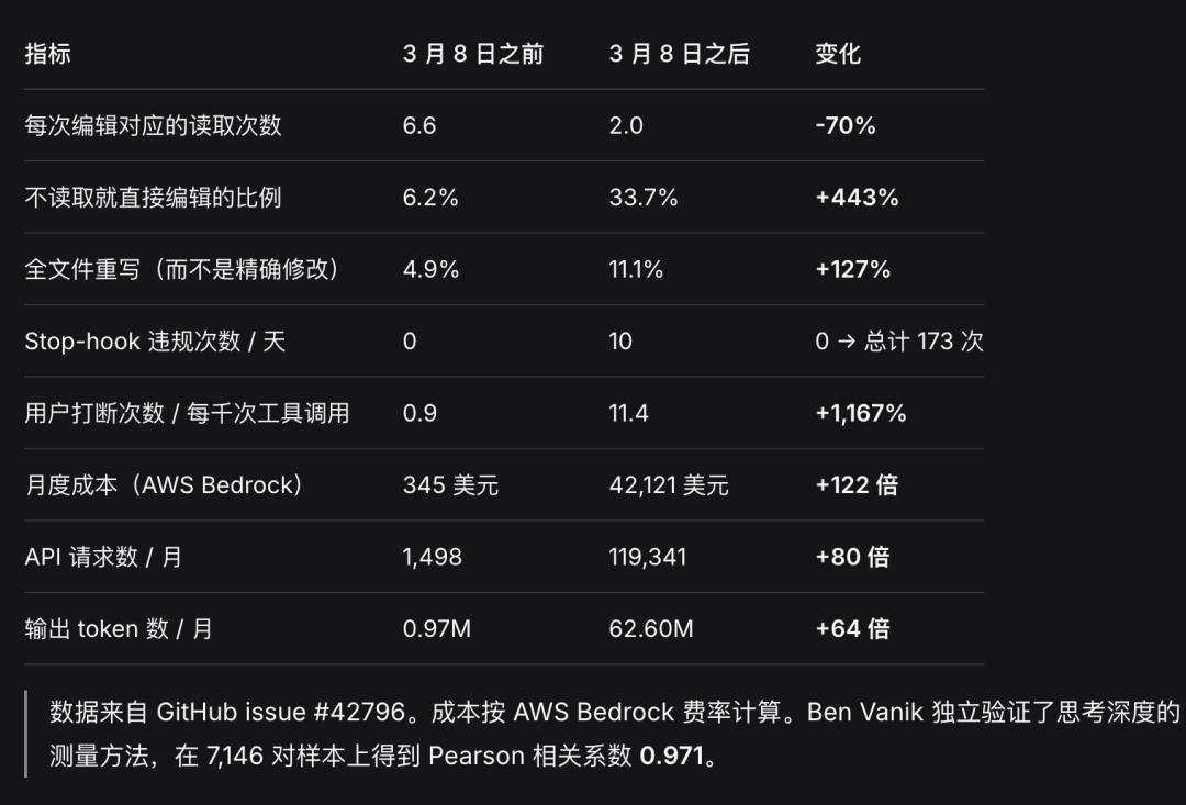 2月底思考深度已崩盘67%,随后Anthropic向用户隐藏了推理过程。
