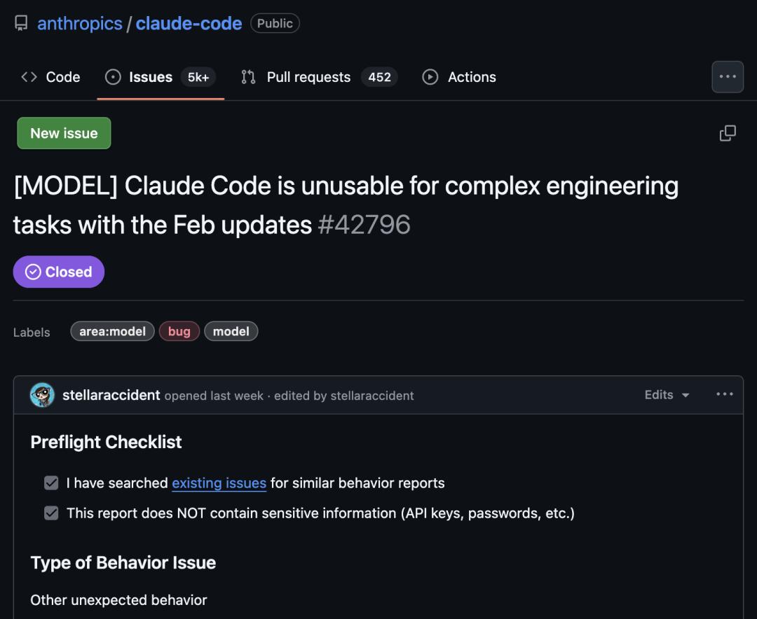 从今年2月前后,不少Claude用户明显感觉产品「变了」,怨声载道:看似没有系统故障,但输出更浅、更急于给出修改结果,简单的任务也会多次失败。