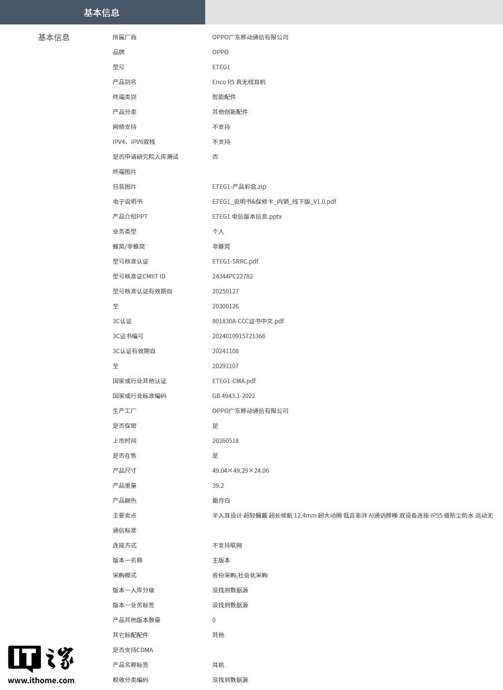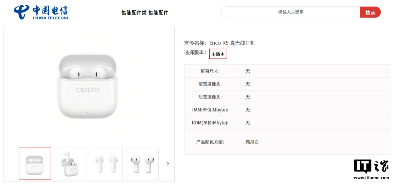 IT之家 4 月 9 日消息,型号为“ETEG1”的 OPPO Enco R5 无线耳机已现身中国电信终端产品库,采用半入耳设计,提供霜月白配色,价格暂未公布。