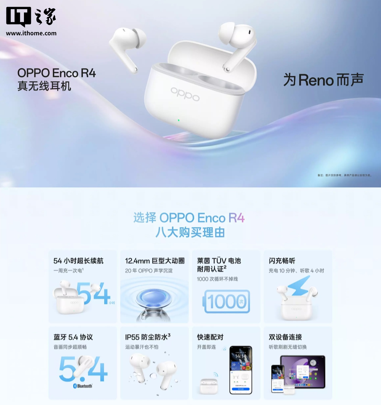 作为参考,目前 OPPO Enco R 系列最新的产品为 OPPO Enco R4,其采用入耳式设计,配备 12.4mm 大动圈,支持 54 小时长续航、IP55 防尘防水、双设备连接等,定价 299 元(属于赠品不支持单独购买)。