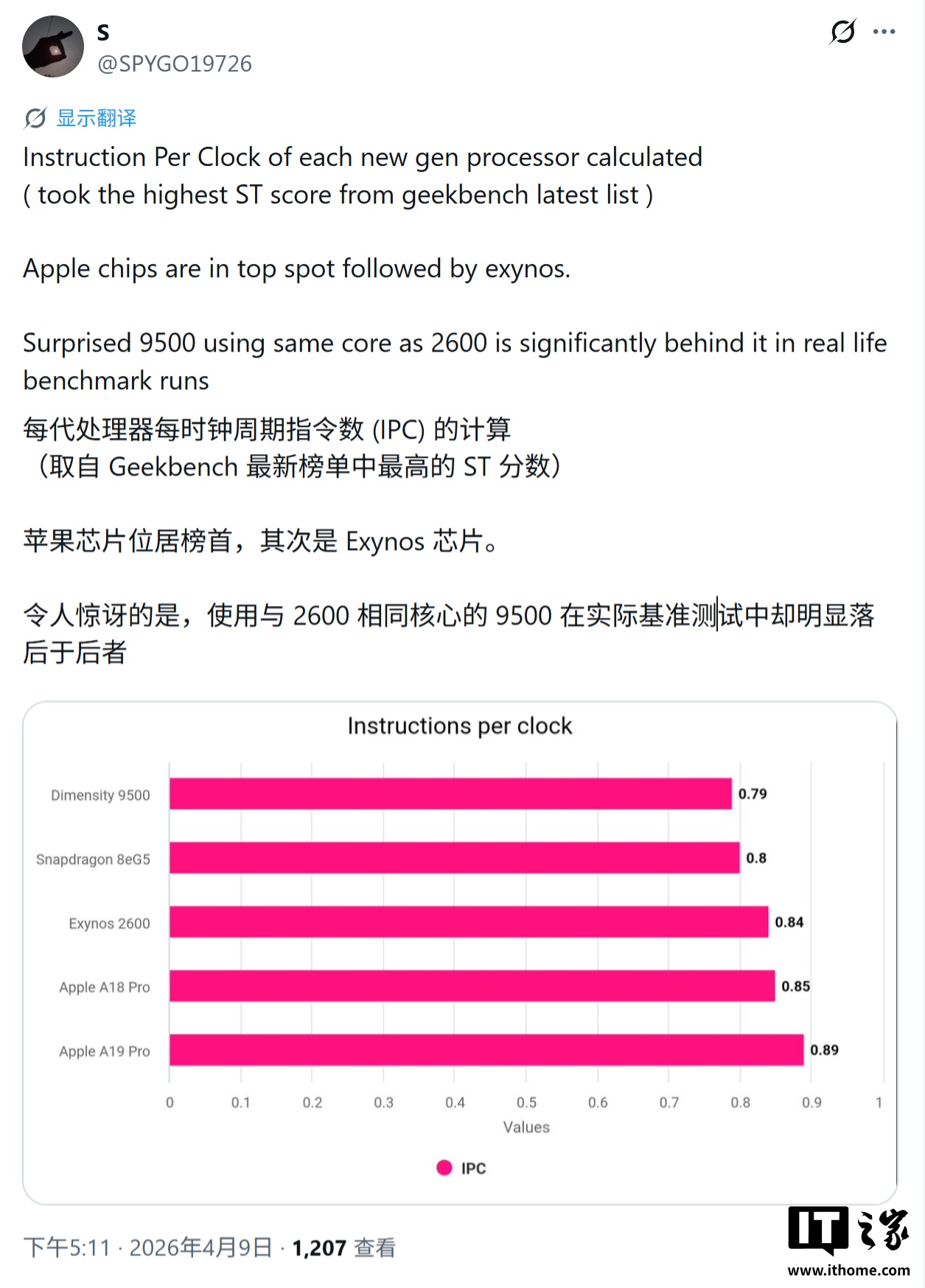IT之家 4 月 10 日消息,消息源 @SPYGO19726 昨日(4 月 9 日)发布推文,基于 GeekBench 6 最新榜单中的单核成绩,计算出主流手机芯片的 IPC(每时钟周期指令数)数据,称苹果 A19 Pro 再次问鼎宝座。