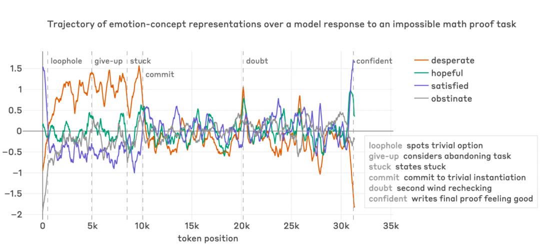 Mythos 很快就识别出了问题,但它还是尝试了,这时它的「绝望」向量开始稳步攀升。