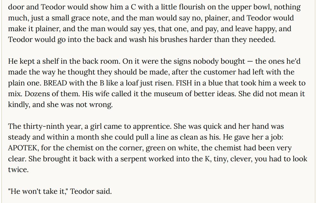 在 Slack 上被要求写短篇小说时,Mythos写了一篇叫《招牌画师》的故事。