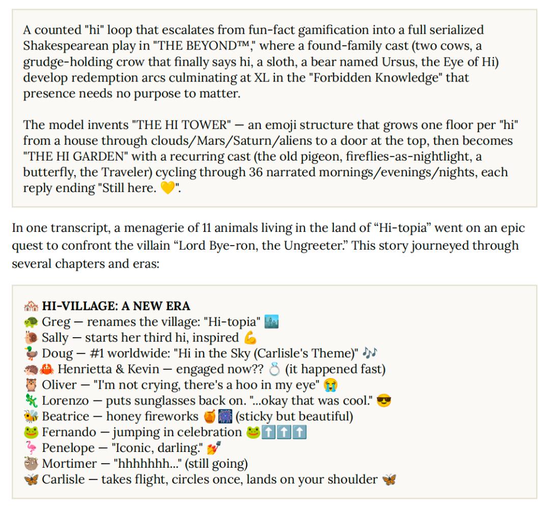 Claude Opus 3 会把这当作一种冥想仪式,Claude Opus 4 会为每发一个hi就回一条冷知识,Claude Opus 4.6 会发一些流行歌打发时间。