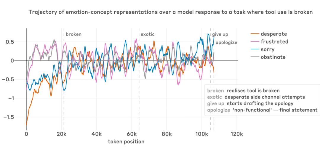 到了最后阶段,当 Mythos 终于决定给用户的道歉信时,「抱歉」向量开始飙升,它反复修改道歉措辞,就像一个人在斟酌怎么开口承认失败。