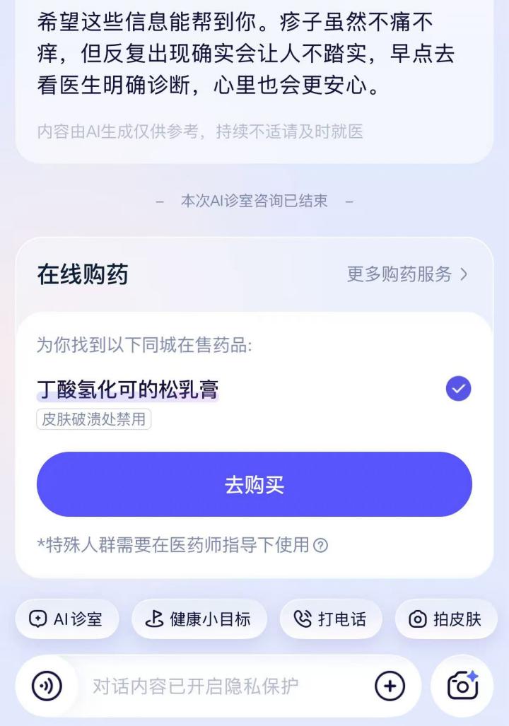AI大模型集体在“看病”中,能做到适老化的根源,就是能针对性的问出细致问题,给出最适合当下的建议,在线上问诊最后给出应该吃什么药,并增设一键订购的选项。