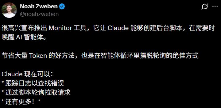 同在今天,Anthropic为Claude带来了名为——Monitor的重量级工具更新。