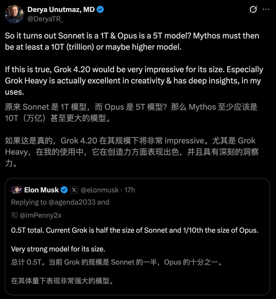 对此,有大佬猜测,Claude Mythos体量至少是10T,甚至更大级别。