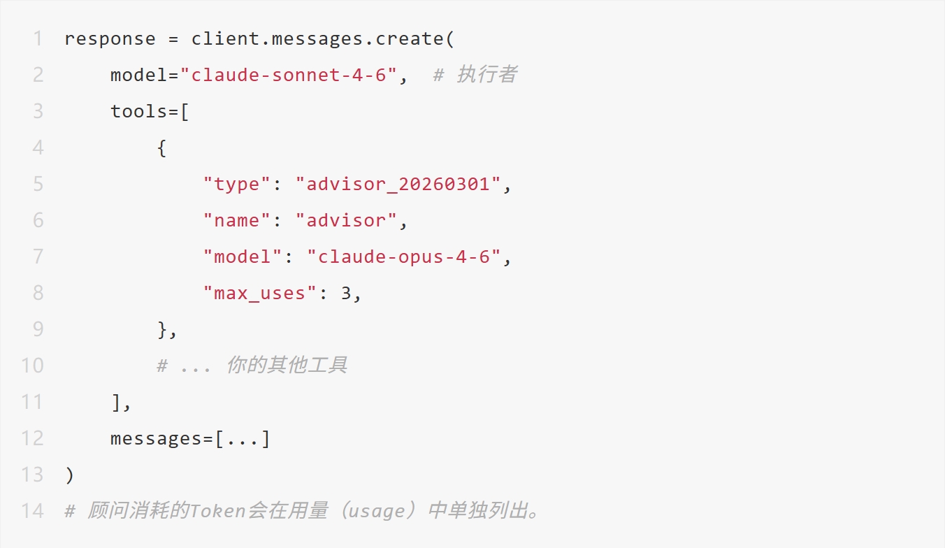 在Messages API请求中声明advisor_20260301,模型的交接就会在单次/v1/messages请求的内部静默完成——不需要额外去回传数据或管理上下文。