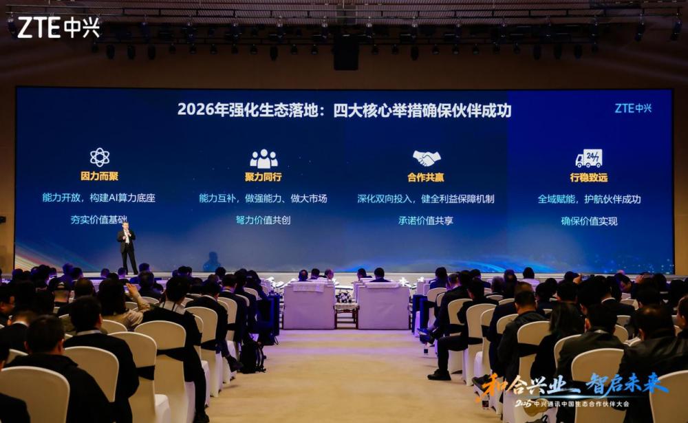 针对 2026 年生态发展重点,王翔向合作伙伴明确了核心方向:围绕 “开能力、强合作、共利益、优赋能” 四大核心举措,持续深化与生态伙伴的全方位合作。其中,“开能力” 聚焦核心能力层、基础设施层、能力平台层、应用层、终端层,全面开源开放核心能力,依托架构级协同优化优势,提升系统兼容性与性能,与伙伴共建开放、高效的 AI 算力底座;“强合作” 注重以客户为中心,整合产业链的优质生态资源,与伙伴能力互补,加强与伙伴在“技术-市场”的双向联动,做强AI全栈全场景能力,深耕“6大重点行业+30 个垂直子行业+240 个细分场景”市场。;“共利益” 即深化双向投入,健全利益保障机制,打造更多元的合作模式,共享更大的商机资源池,提供更多的利益空间,优化更好的合作机制;“优赋能” 则围绕技术、营销、培训、数字化服务四大维度,为伙伴提供系统性的全域赋能,助力伙伴提升核心能力与市场竞争力,同时全面升级一站式数字化服务体系,基于Co-Claw ,为伙伴提供更 “智”“惠” 的智能助手,全面向市场释放 “中兴 + 伙伴” 的协同合力。
