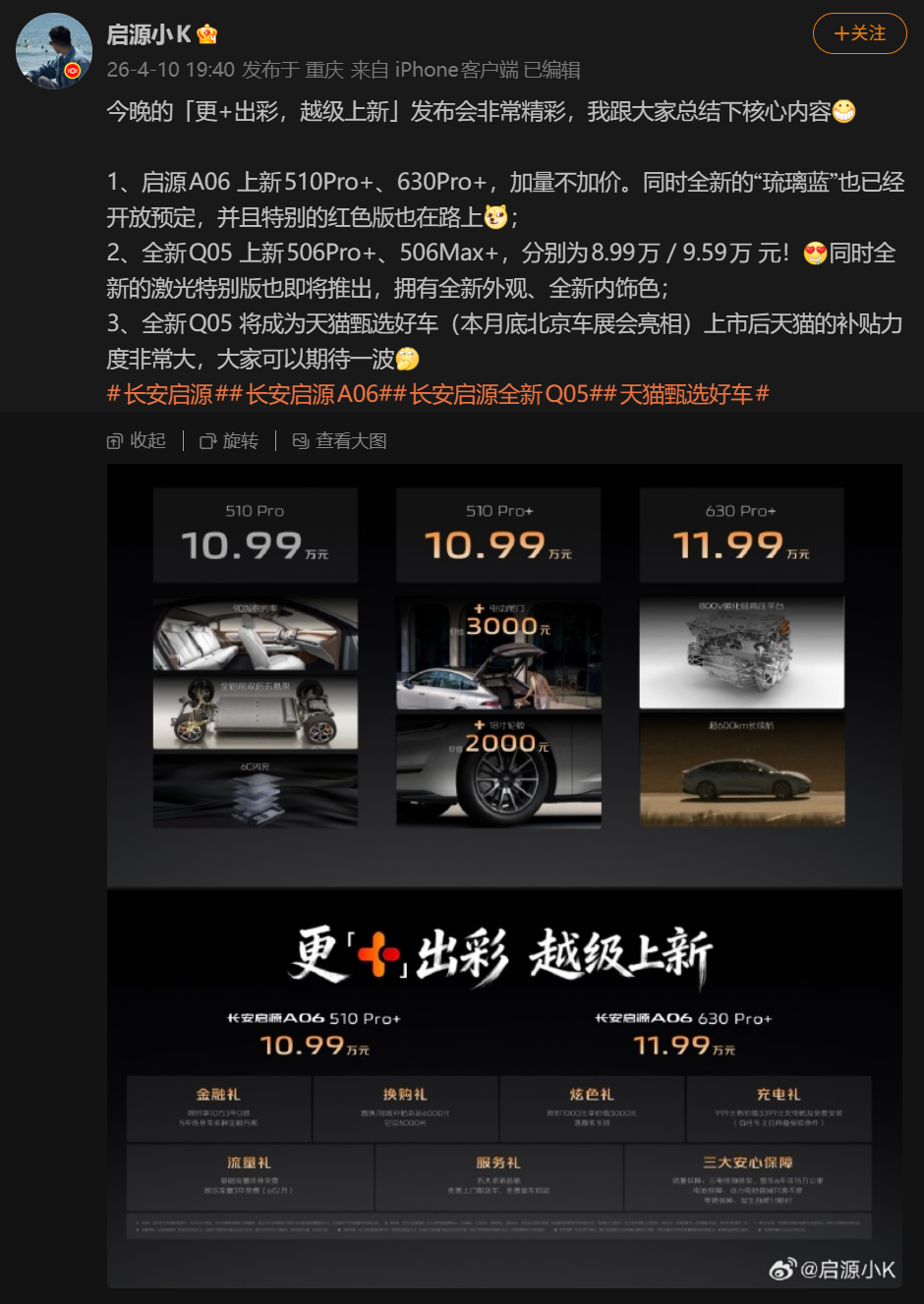 IT之家 4 月 10 日消息,长安启源 A06、全新 Q05 现已上市,两款车型均是年代改款,外观方面变化不算太大,售价 8.99 万元起。