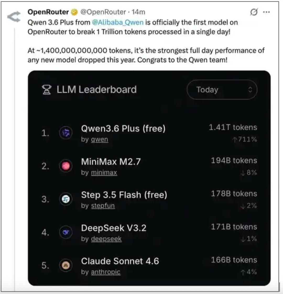 图:Qwen3.6Plus冲上OpenRouter日榜榜首来源:网络