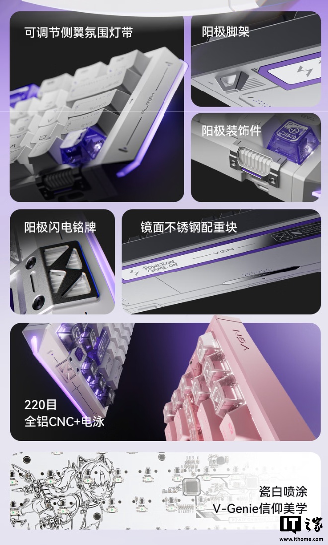 系列键盘整体尺寸 340.3 x 113.3 x 38mm,重量 1Kg,采用 CNC 铝合金外壳,其中幻影黑 / 白及黑骑士 / 银骑士采用阳极氧化工艺,而紫光战魂 / 粉光战魂采用电泳工艺。