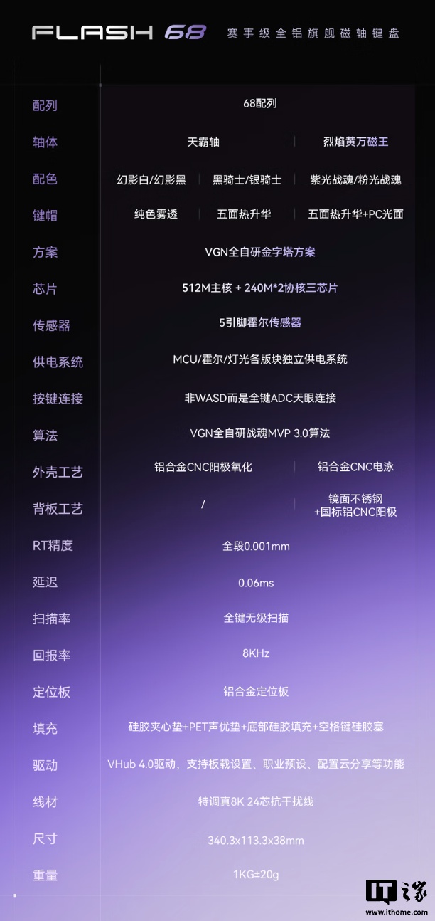 IT之家 4 月 10 日消息,VGN 现已在京东上架“闪电 68”有线机械磁轴键盘,不同配色 / 轴体价格不同,IT之家整理规格如下: