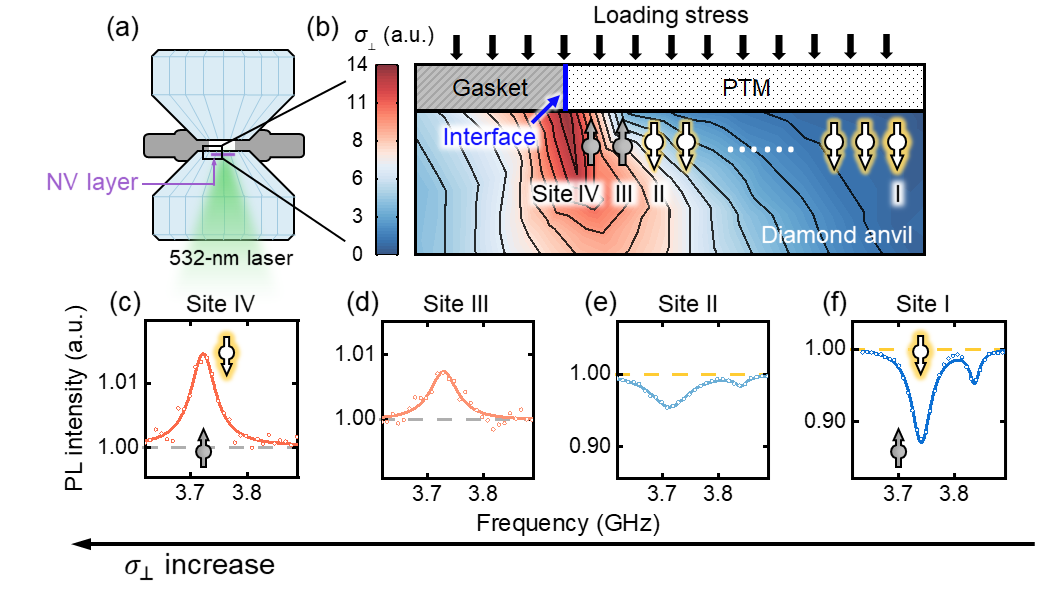 图:(a) 金刚石对顶砧高压装置。(b)破坏对称性的应力梯度下的自旋极化反转现象示意图。(c)-(f) 不同应力区域NV色心的ODMR光谱。