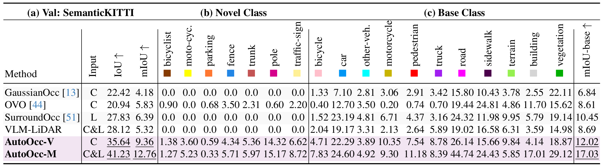 表2 在SemanticKITTI基准上,AutoOcc取得了领先的跨数据集与未知类别的零样本泛化结果